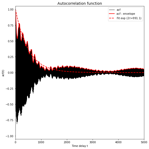 We can now see that the fit to the envelope of the envelope was not well performed, i.e. the red dashed line does not follow the red solid line. Furthermore, we also see that the resulting exponential correlation time is 1 (corresponding to an integrated correlation time of 1 as indicated in the plot legend). This value of
