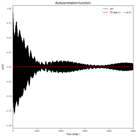 The fit now indeed nicely follows the red solid line again. The choice of p0=1000 was made just based on the previous plots of the acf which clearly indicated a decay in the order of magnitude of 1000 timesteps.
