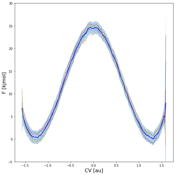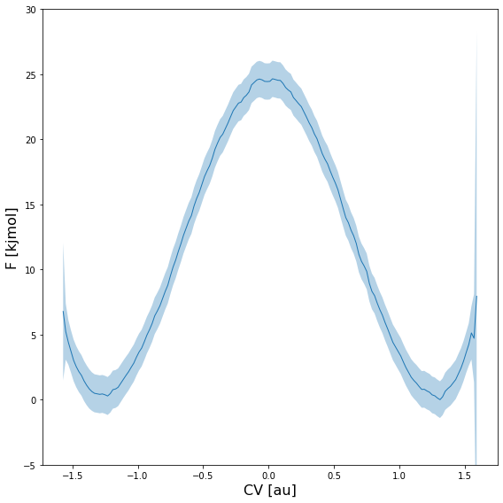 In case the histogram or free energy profile had error bars associated (see previous section), they will be included as shaded regions as illustrated in the example below: