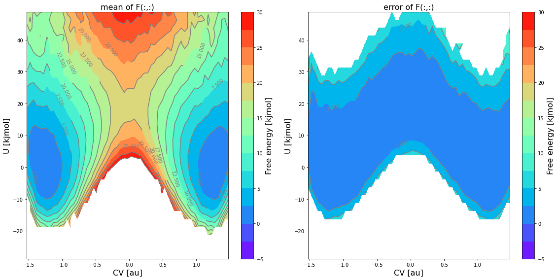 … a 2D contour plot of the mean free energy itself as well as the error bar using the