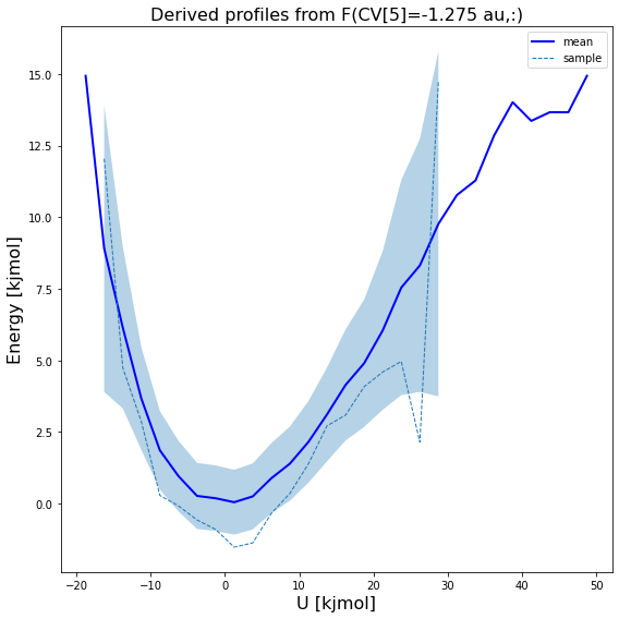 obsskeyword:… 1D plot of a slice along one of the 2 CVs at given value of the other CV, and this for both the mean free energy itself as well as a random sample from the error distribution: